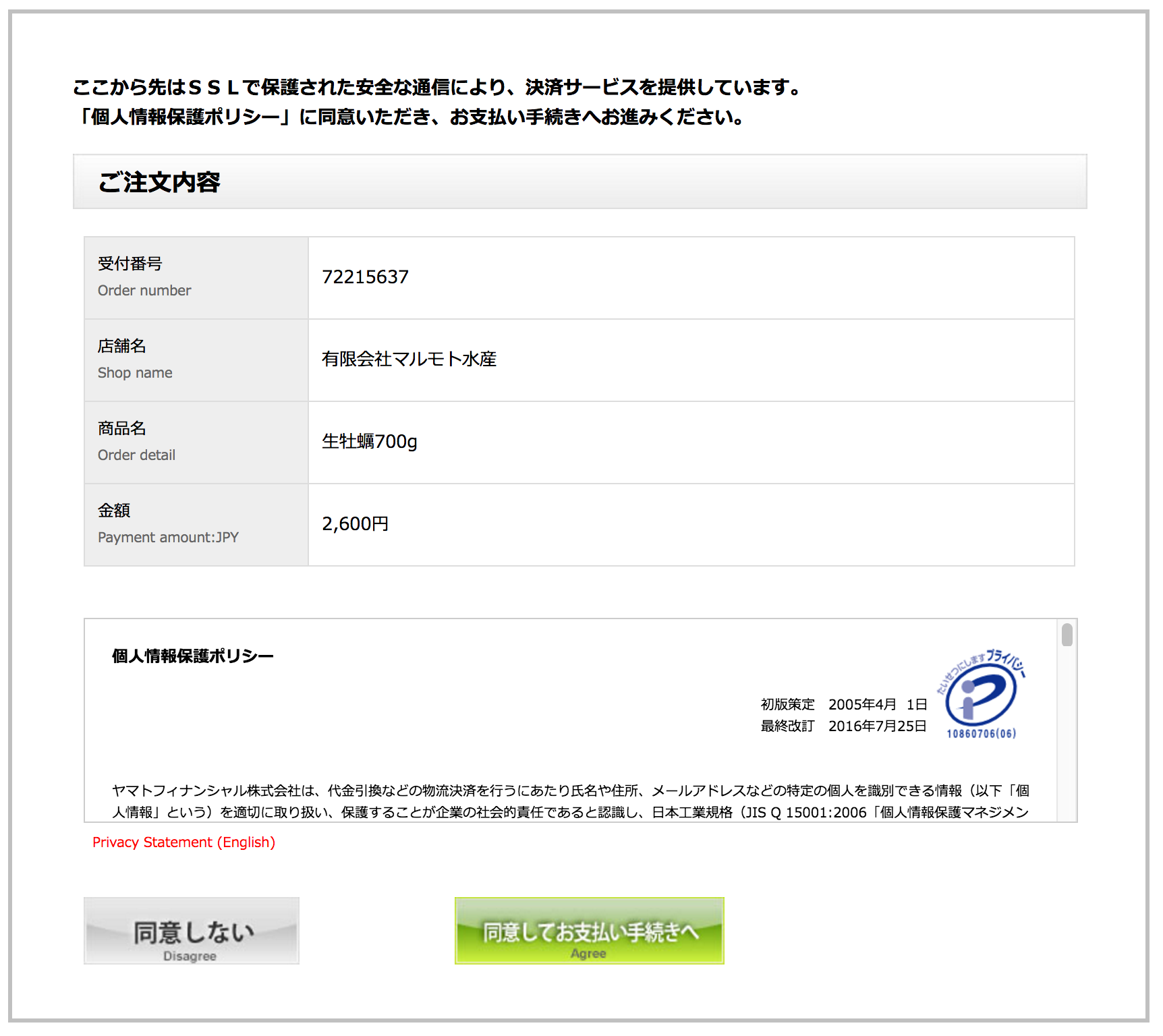 ⑨クロネコwebコレクトの画面になります。個人情報保護ポリシーに同意いただき「同意してお支払手続きへ」ボタンを押します。